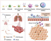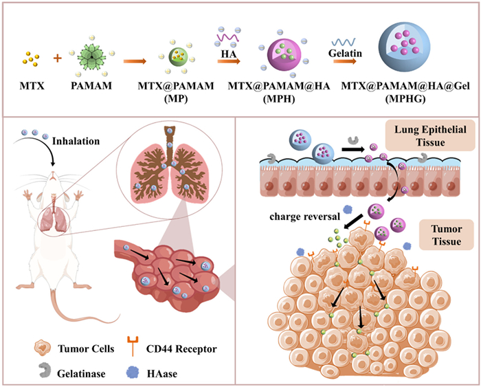 Herein, we propose a novel approach utilizing inhaled multilevel size-tunable, charge-reversible and mucus-traversing composite microspheres as trojan horses, aiming to enhance drug delivery and improve lung cancer therapy (Fig. 1). The composite microspheres offer the potential to address the three key challenges of inadequate lung deposition, ineffective mucus penetration and limited tumor tissue penetration. Small particles loaded with the anticancer drug methotrexate (MTX), denoted as MTX@PAMAM (MP), were encapsulated within hyaluronic acid (HA) nanoparticles, forming a formulation referred to as MTX@PAMAM@HA (MPH) [40]. Subsequently, inhalable nanoparticle-carrier composite microspheres MTX@PAMAM@HA@Gel (MPHG) encapsulating MPH nanoparticles were prepared using gelatin (Gel) as the carrier matrix. Upon the delivery of MPHG to the lungs, the gelatin shells undergo rapid dissolution due to enzymatic action and temperature, resulting in the release of MPH. This marks the first stage of particle size alteration, effectively addressing the challenge of pulmonary delivery inefficiency. Furthermore, as the released MPH is transported to the tumor sites, it undergoes rapid degradation facilitated by hyaluronidase (HAase), an enzyme overexpressed in tumor tissues. This enzymatic degradation leads to the liberation of the enclosed MP spheres, consequently enhancing the drug's penetration into tumor tissues. Rigorous evaluations demonstrated that these composite microspheres not only enhance pulmonary drug delivery efficiency but also significantly improve drug penetration within tumor tissues. Consequently, the composite microspheres MPHG present a promising vehicle for the pulmonary delivery of chemotherapeutic agents for treatment of lung cancer.