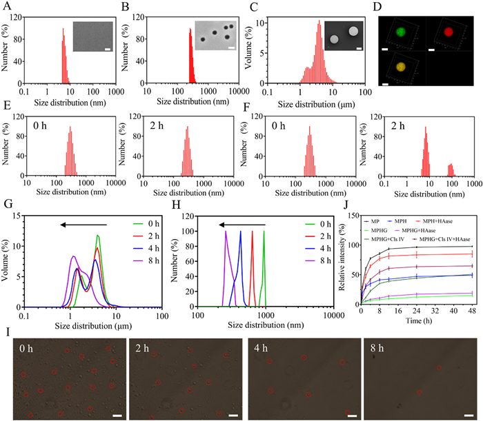 | Fig. 2. Characterization of MPHG. (A) Size and morphology of MP. Scale bar: 50 nm. (B) Size and morphology of MPH. Scale bar: 500 nm. (C) Size and morphology of MPHG microspheres. Scale bar: 2 µm. (D) The fluorescence distribution inside the microspheres by laser confocal microscopy. Scale bar: 5 µm. (E) Degradation particle size of MPH in PBS without HAase. (F) Degradation particle size of MPH in PBS with HAase. (G) Degradation particle size of MPHG at four time points of 0, 2, 4, and 8 h were determined at the micron level. (H) Degradation particle size of MPHG at four time points of 0, 2, 4, and 8 h were determined at the nanometer level. (I) Degradation morphology of MPHG at four time points of 0, 2, 4, and 8 h. Scale bar: 50 µm. (J) Release curves of MP, MPH and MPHG under different conditions. | |