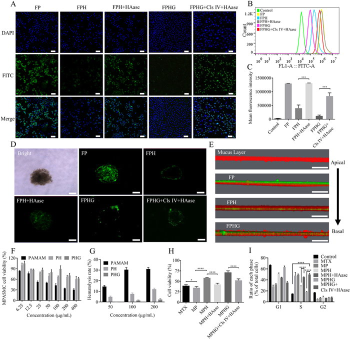 | Fig. 3. Therapeutic efficient and safety evaluation of MPHG in vitro. (A) Laser confocal microscopy images of A549 cells uptake of FP, FPH, FPH+ HAase, FPHG and FPHG + Cls Ⅳ + HAase. Scale bar: 100 µm. (B) Flow cytometry analysis of cellular uptake of FP, FPH, FPH+ HAase, FPHG and FPHG + Cls Ⅳ + HAase in A549 cells. (C) Quantitative analysis of the flow cytometry data (n = 3). (D) Penetrating capability of FP, FPH, FPH + HAase, FPHG and FPHG + Cls Ⅳ + HAase on A549 tumor spheroids. Scale bar: 150 µm. (E) The transport ability of particles across the mucus layer was evaluated by CLSM in the transwell plate. The red and green fluorescence represent the mucus and particles, respectively. Scale bar: 50 µm. (F) The cytotoxicity profiles of blank carriers (PAMAM, PH, PHG) in MPASMC at different concentrations measured by MTT assays (n = 6). (G) Hemolysis percentage of PAMAM, PH and PHG at different concentrations (n = 3). (H) MTT assay for the cytotoxicity of MTX, MP, MPH, MPH + HAase, MPHG and MPHG + Cls Ⅳ + HAase to A549 cells (n = 6). (I) Quantitative analysis of the cell cycle analysis graphs in control, MTX, MP, MPH, MPH + HAase, MPHG and MPHG + Cls Ⅳ + HAase (n = 3). Data are presented as mean ± standard deviation (SD). *P < 0.05, ***P < 0.001, ****P < 0.0001. | |
