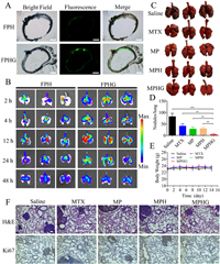 | Fig. 4. Therapeutic efficient evaluation of MPHG in vivo. (A) Frozen section of tracheas from mice following inhalation administration of FPH and FPHG observed by inverted fluorescence microscope. Scale bar: 250 µm. (B) In vivo fluorescent images of lungs of mice after administration of FPH and FPHG. (C) Appearances of the lungs after treatment. (D) Quantification of lung metastasis nodules. (E) Body weight changes of the tumor-bearing mice were measured during 2 weeks post treatment. (F) H&E and Ki67 staining of the lung tissue sections. Scale bar: 75 µm. Data are expressed as the mean ± SD (n = 5). **P < 0.01, ***P < 0.001. | |