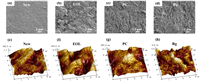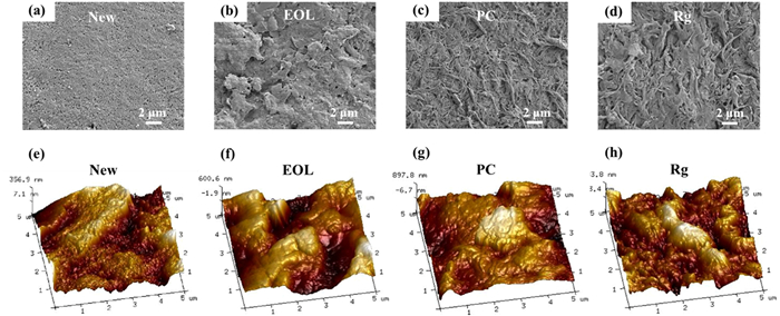 | Fig. 1. SEM images of the (a) new, (b) EOL, (c) PC, and (d) Rg membrane. AFM 3D images of the (e) new, (f) EOL, (g) PC, and (h) Rg membrane. | |
