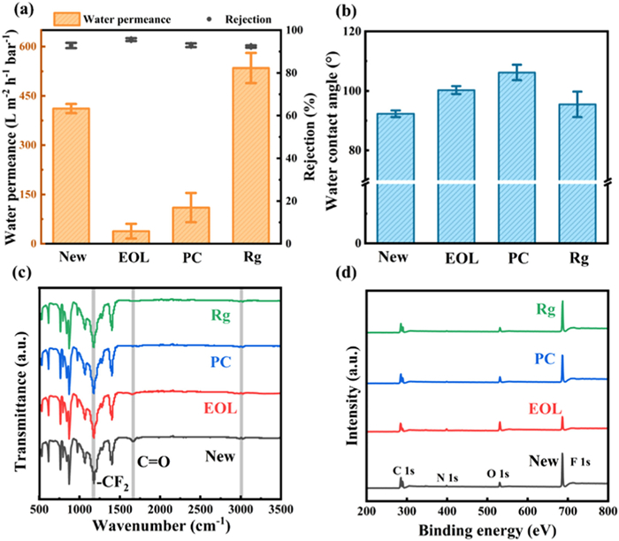 The hydrophilicity of membranes was determined by water contact angle measurements (Fig. 2b). In general, an increased contact angle corresponds to a higher hydrophobicity. The new membrane exhibited a water contact angle of 92.3° ± 1.1°. The contact angle of the EOL membrane increased to 100.3° ± 1.3° result from the accumulation of hydrophobic foulants [36]. Furthermore, the membrane after preliminary cleaning with NaClO and critic acid exhibited a slightly higher contact angle (106.2° ± 2.6°), indicating a potential increase in hydrophobicity of the membrane due to the effect of preliminary cleaning process [37]. As a result of the impact of solvent-based processing for removing hydrophobic foulants from the membrane, water contact angle of the Rg membrane exhibited a remarkable decrease to 95.5° ± 4.3°, showing a more hydrophilic surface compared with the EOL or PC membrane.