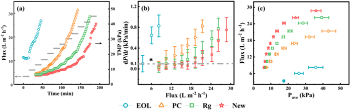 To assess the antifouling performance of the membranes, flux-step experiments were conducted with critical flux (Jc) determination in a MBR system fed with sewage sludge. The critical flux refers to the threshold at which the fouling rate becomes significantly notable [41]. Consequently, Jc serves as a key indicator for membrane users to determine the appropriate time for membrane cleaning, and the Jc of different membranes could reflect their resistance to fouling [42]. Flux-TMP profile with operation time of four different membranes was performed from a low flux value (Fig. 3a). For each membrane, TMP initially remained stable at the imposed flux, but started to increase rapidly at a certain time point. The new membrane exhibited the longest operation time (about 150 min) until pressure reached 40 kPa. In contrast, the EOL membrane exhibited the fastest increasing rate of TMP, which increased rapidly from 17.9 kPa to 42.2 kPa in 45 min. The PC membrane had a slower increasing rate of TMP than the EOL membrane, but still presented a relatively high fouling tendency. The TMP of the Rg membrane increased slowly during the first 45 min (from 6.4 kPa to 9.7 kPa) and then increased rapidly up to 45 kPa at around 140 min. It could be inferred that the Rg membrane exhibited a comparable antifouling performance to the new membrane.