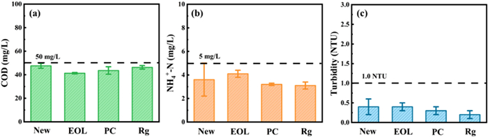 In order to further assess the long-term performance of Rg membranes, filtration tests for treating municipal wastewater in a lab-scale MBR were carried out. The water quality of the effluent for each membrane was evaluated (Fig. 4). No distinct difference was noticed in chemical oxygen demand (COD), ammonia nitrogen (NH4+-N) and turbidity in the permeate of the new, EOL, PC, and Rg membranes. The effluent COD of the Rg membrane was 46.3 ± 1.5 mg/L, achieving a removal rate over 90% (Fig. 4a). Besides, the effluent of the Rg membrane demonstrated NH4+-N and turbidity levels of 3.1 ± 0.3 mg/L and 0.2 ± 0.1 NTU, respectively, which were close to the effluent of the new membrane (Figs. 4b and c). The effluent of the Rg membrane met the discharge standard of pollutants for urban wastewater treatment plants in China [43], highlighting the efficacy of membrane regeneration strategy in guaranteeing the effluent quality in MBR-based municipal wastewater treatment.
