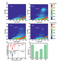 | Fig. 5. Difference analysis of (a) fluorescence spectra of the new, EOL, CC and Rg membrane, (b) ATR-FTIR spectra of pristine and used TEP solvent, and (c) the porosity of the new, EOL, CC and Rg membrane. | |