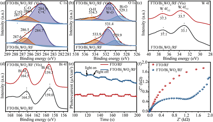 | Fig. 2. XPS spectra of FTO/Bi2WO6/RF at (a) C 1s, (b) O 1s, (c) W 4f, and (d) Bi 4f core levels (Vis — the materials after light irradiation and another set without light exposure). (e) Transient photocurrent responses and (f) EIS plots of FTO/RF and FTO/Bi2WO6/RF. | |