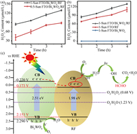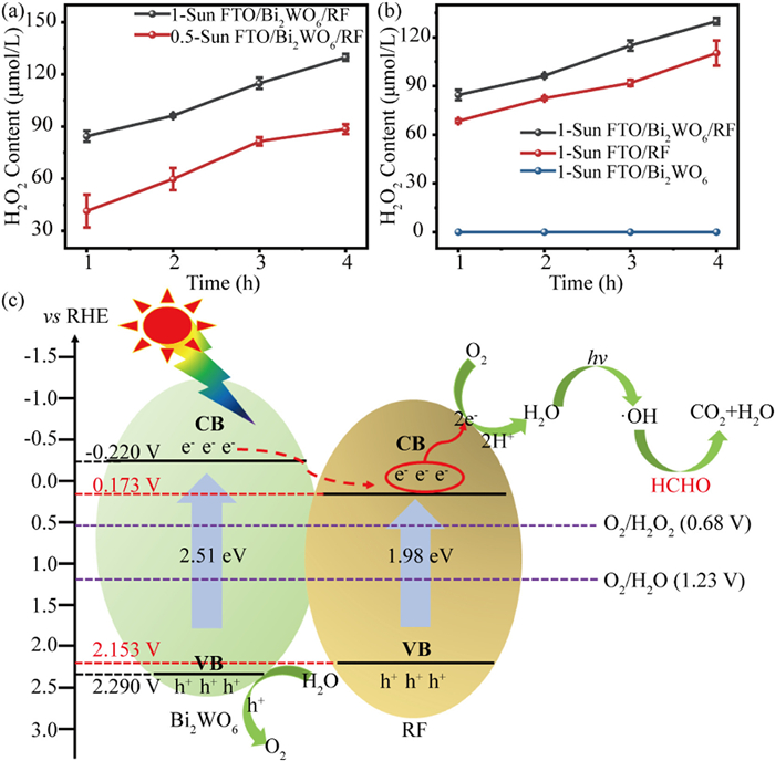 | Fig. 4. Factors affecting photocatalytic H2O2 generation of FTO/Bi2WO6/RF. (a) H2O2 concentrations produced by FTO/Bi2WO6/RF under 1 sun and 0.5 sun of light irradiation. (b) H2O2 concentrations produced by FTO/Bi2WO6/RF, FTO/RF and FTO/Bi2WO6 under the same light intensity (1 sun). (c) Energy band diagram of Bi2WO6 and RF resin for different reactions. | |