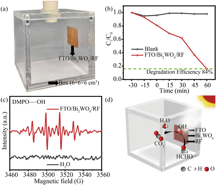 | Fig. 5. (a) A closed box used to simulate the inhouse degradation experiment. (b) Efficiency of HCHO degradation within 1 h. (c) EPR of air in the box. (d) Schematic of indoor HCHO degradation mechanism. | |
