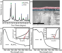 | Fig. 1. (a) XRD pattern of FTO/Bi2WO6/RF. (b) Cross-sectional SEM image. (c) UV–vis diffuse reflectance spectra of Bi2WO6 and (d) RF resin. Inset: corresponding bandgaps estimated by plotting (αhv)2 versus hν, where α and ν are the absorbance and wavenumber, h is the Planck constant. | |