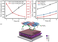 | Fig. 3. Photocatalytic H2O2 generation of FTO/Bi2WO6/RF. (a) H2O2 concentration produced under 1 sunlight illumination and 4 h of continuous oxygen supply (black), H2O2 production rate over 4 h (red). (b) Effects of oxygen and light on the H2O2 production (black: with light and oxygen, blue: with light and without oxygen, red: with oxygen and without light). (c) Schematic diagram of oxygen cycles on Bi2WO6 and RF. | |