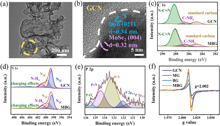X-ray photoelectron spectroscopy (XPS) was employed to determine the elemental composition and surface chemical state of the composites. Fig. S3 (Supporting information) exhibits the elemental spectra of GCN and MBG, displaying clear peaks of C, N and O. Nearly no signal of Mo, Se, and P is observed due to their low concentrations in the samples. In C 1s XPS spectra (Fig. 1c), the peaks at 288.2, 286.6 and 284.8 eV in both GCN and MBG correspond to N—C═N in the GCN framework, NHx (x = 1, 2) at the edge of heptazine unit, and standard C—C, respectively [39]. Similarly, in N 1s XPS spectra (Fig. 1d), MBG exhibits peaks similar to those of GCN, where the peaks at 398.5, 399.5, 401.0 and 404.5 eV are attributed to C—N═C (N2C), tricoordinate nitrogen (N3C), amino group (N−Hx) and positively charged heterocycle, respectively [40]. As shown in Fig. S4 (Supporting information), the peaks of 130.5 eV, 131.3 eV and 135.2 eV correspond to P 2p3/2, P 2p1/2 and oxidized phosphorus of the P element in Bpn, respectively. Similarly, the peaks of P 2p3/2 and P 2p1/2 are located at the same position in MBG (Fig. 1e), implying the basic composition of Bpn in MBG is maintained. The peaks at 133.3 and 134.4 eV represent P—N and P═N bonds, respectively, indicating that Bpn is connected to GCN through a P-bridging [18,41]. Furthermore, the presence of electron spin resonance (ESR) signals at g = 2.002 in Fig. 1f indicates the existence of N-vacancies resulting from the surface defects of N in GCN. The ESR signal of N vacancies in MBG is stronger than those in Bpn/GCN (BG), MoSe2/GCN (MG) and GCN, revealing the formation of abound covalent bonds when the heterostructure involving GCN, MoSe2 and Bpn is constructed [42,43]. The N-vacancies can effectively adjust the band structure of g-C3N4, improve the ability of visible light capture, and increase the number of surface-active sites, thereby improving the photocatalytic performance [44,45].