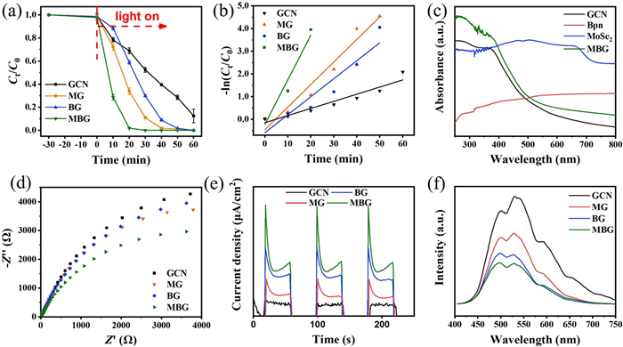 | Fig. 2. (a, b) Photocatalytic performance and corresponding first-order kinetics curves of prepared photocatalysts. (c) UV–vis diffuse reflectance spectra (DRS) of MoSe2, Bpn, GCN and MBG, (d) EIS spectra of GCN, MG, BG and MBG, (e) photocurrent response of GCN, MG, BG and MBG, (f) PL spectra of GCN, MG, BG and MBG. | |