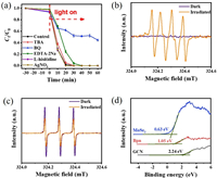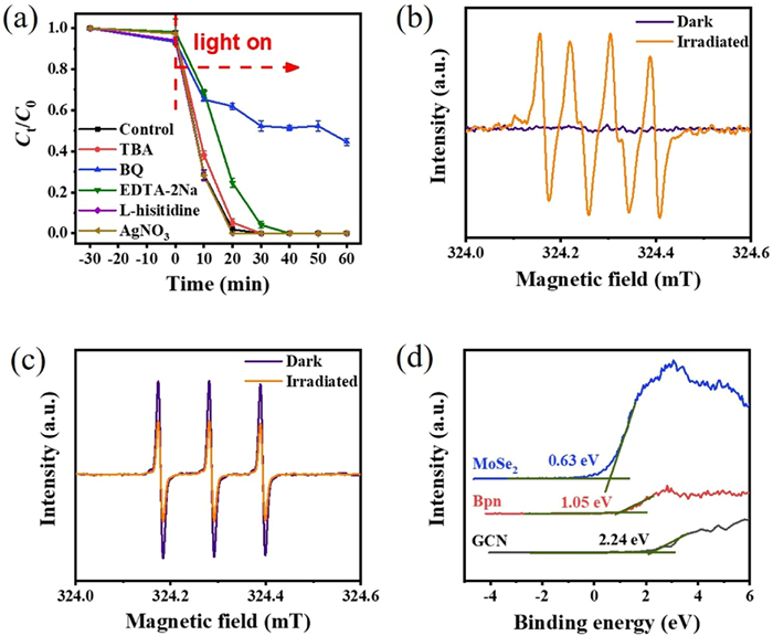 | Fig. 3. (a) Photocatalytic trapping experiments. (b, c) ESR spectra of DMPO—O2•− and TEMPO-h+. (d) valence band (VB) XPS spectra of GCN, Bpn and MoSe2. | |