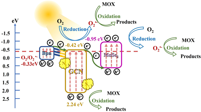 Based on the aforementioned results, we have inferred the mechanism of photocatalytic degradation as illustrated in Fig. 4. Bpn and GCN are characterized as p-type and n-type semiconductors, respectively, resulting in the rearrangement of energy band positions to form p-n junctions [50,46]. The narrow band gap of Bpn facilitates the excitation of electrons upon light exposure, causing them to transfer rapidly to the CB of GCN through the covalent bond between P and N atoms. This process leads to the reduction of oxygen in water, generating O2•− and facilitating the MOX degradation. Furthermore, the formed Z-scheme heterojunction between GCN and MoSe2 allows photoinduced electrons to migrate to the VB of MoSe2 and recombine with h+, leaving the photogenerated electrons in the CB of MoSe2 for the reduction of O2 to produce O2•− (−0.33 eV). N-vacancies also serve as electron traps to enhance the separation of the photogenerated carriers on the GCN surface [41,51], leading to the oxidation of adsorbed MOX by h+ in the VB of GCN.