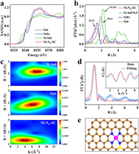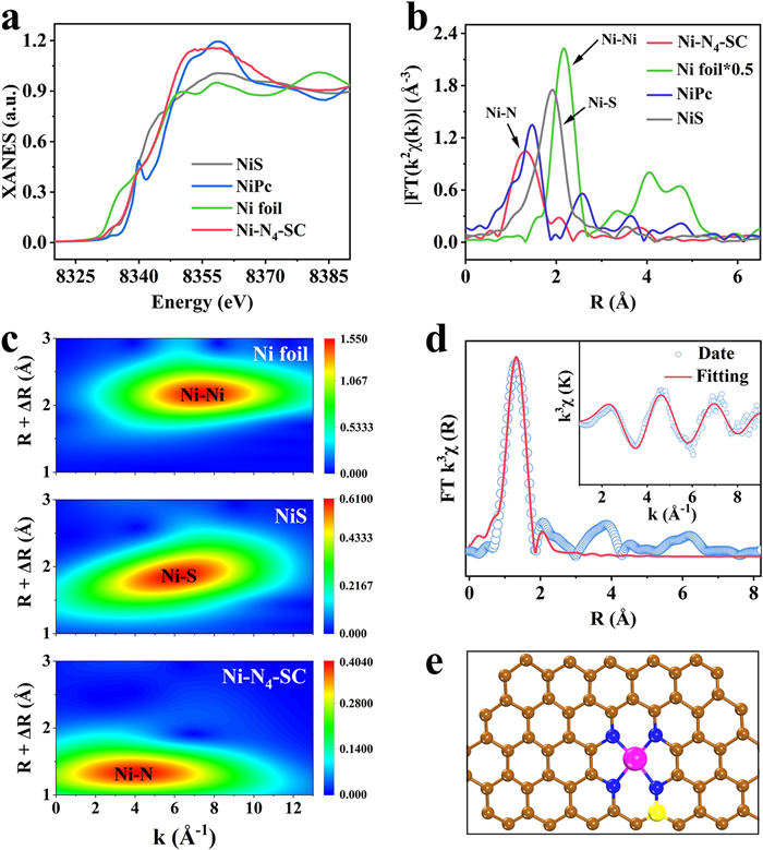 | Fig. 2. (a) Ni K-edge XANES spectra, (b) Fourier transform of Ni K-edge EXAFS spectra, and (c) WT-EXAFS plots of Ni foil, NiS, and Ni-N4-SC. (d) EXAFS fitting curve in R space, and (e) structure model of the Ni-N4-SC. | |