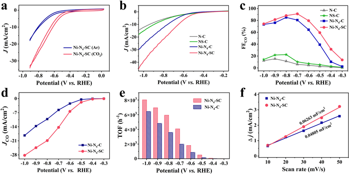 | Fig. 3. (a) CV curves of the Ni-N4-SC under different atmosphere. (b) LSV curves of samples. (c) FECO of samples. (d) CO partial current density (Jco) at different potentials. (e) TOF of Ni-N4-C and Ni-N4-SC at different potentials. (f) Charging current density differences plotted against scan rates. | |