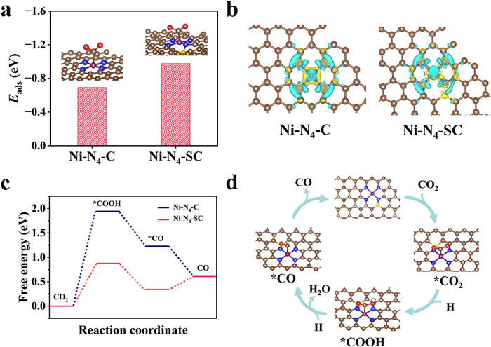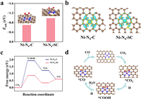 | Fig. 4. (a) Adsorption energies of CO2, (b) charge density difference map, and (c) free energies diagram for the CO2 conversion to CO of the Ni-N4-C and Ni-N4-SC. (d) The proposed reaction paths of Ni-N4-SC for electroreduction CO2 to CO. | |