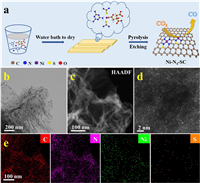| Fig. 1. (a) Synthesis schematic of the Ni-N4-SC. (b) TEM, (c) HAADF-STEM, (d) AC-HAADF-STEM images, and (e) elemental mappings of the Ni-N4-SC. | |