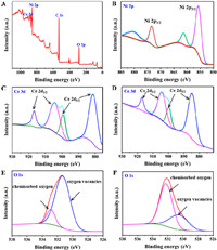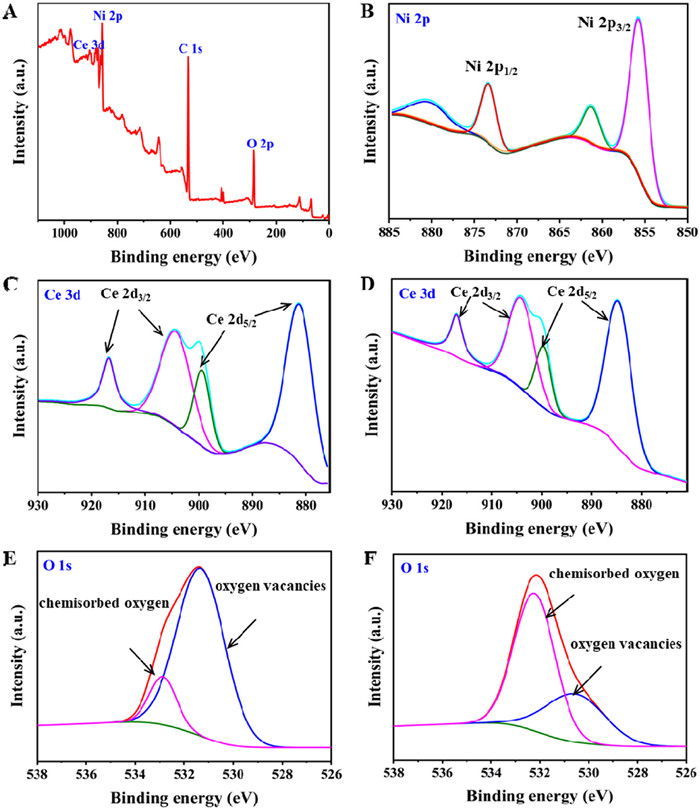 | Fig. 2. (A) XPS spectrum of Ni-CeO2. (B) Ni 2p XPS of Ni-CeO2. Ce 3d XPS spectra of (C) Ni-CeO2 and (D) CeO2. O 1s XPS of (E) Ni-CeO2 and (F) CeO2. | |