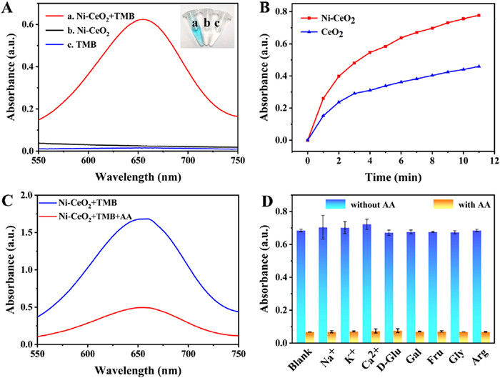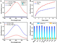 | Fig. 3. (A) Absorption spectra of Ni-CeO2+TMB, Ni-CeO2, and TMB solutions. (B) The reaction rate of Ni-CeO2 and CeO2 over time. (C) Absorption spectra with and without AA in the Ni-CeO2/TMB system. (D) The absorbance measured in the presence of other ions (200 mmol/L) and small molecules (20 mmol/L) with and without AA (20 mmol/L). | |