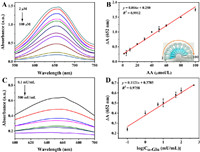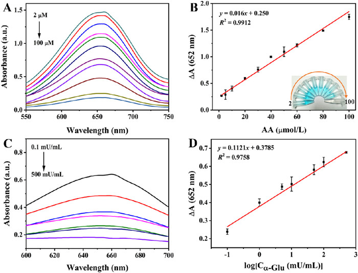 | Fig. 4. (A) Absorption spectra of the Ni-CeO2/TMB system with different concentrations of AA. (B) The linear relationship between AA concentration and ∆A at 652 nm (∆A = A0 - A, where A0 and A stand for the absorbance values of the solution at 652 nm in the absence and presence of AA, respectively). (C) Absorption spectra of the system with various α-Glu concentrations. (D) The linear relationship between ∆A and the log value of α-Glu activity. (∆A = A0 - A, where A0 and A represent the absorbance values of the solution at 652 nm in the absence and presence of α-Glu, respectively). | |