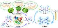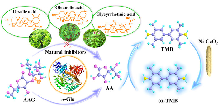 In this work, we developed Ni-doped CeO2 nanorods with oxidase-like activity in DESs composed of L-Pro and Ce(NO3)3·6H2O. Based on the inhibitory effect of ascorbic acid (AA) on the color reaction of TMB catalyzed by Ni-CeO2, 2-O-α-D-glucopyranosyl-L-ascorbic acid (AAG) was acted as substrate to construct a new approach for the colorimetric determination of α-Glu activity. When the activity of α-Glu was inhibited, the oxidation reaction of TMB resumed. Herein, acarbose was used as a control to screen three terpenoids (ursolic acid, uleanolic acid, glycyrrhetinic acid) isolated from natural products (Scheme 1). The results showed that ursolic acid and oleanolic acid had good inhibitory effects. The constructed colorimetric sensor platform is simple and cost-effective and is expected to become a simple method for screening inhibitors in natural products.