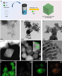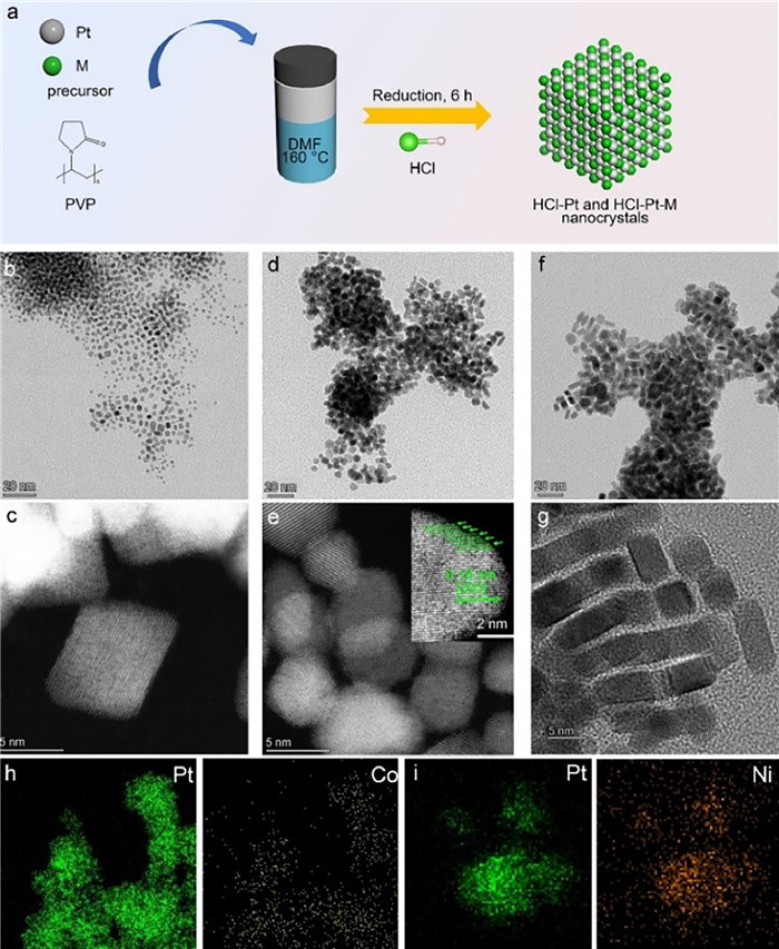 | Fig. 1. (a) Schematic illustration of the preparation process of samples. Structural characterizations of HCl-Pt and HCl-Pt-M NCs. (b) TEM and (c) HAADF-STEM image of HCl-Pt NCs. (d) TEM and (e) HAADF-STEM images of HCl-Pt-Ni NCs. (f) TEM and (g) HRTEM images of HCl-Pt-Co NCs. The inset of (e) shows the formation of unsaturated atoms on HCl-Pt-Ni NCs. EDS-mapping profile of (h) HCl-Pt-Co and (i) HCl-Pt-Ni NCs. | |