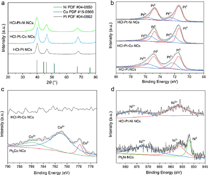 | Fig. 2. Structural characterizations of the nanocrystals. (a) XRD patterns and (b) Pt 4f XPS spectra of HCl-Pt NCs, HCl-Pt-Co NCs and HCl-Pt-Ni NCs. (c) Co 2p spectra of Pt3Co NCs and HCl-Pt-Co NCs. (d) Ni 2p XPS spectra of Pt3Ni NCs and HCl-Pt-Ni NCs. | |