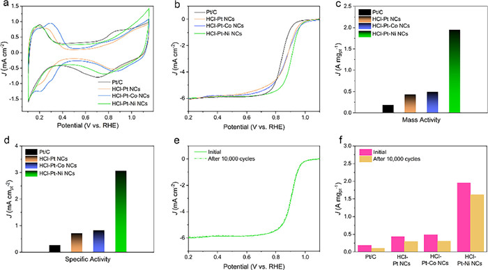 | Fig. 4. Electrocatalytic ORR performance. (a) CV curves, (b) LSV curves, (c) mass activity (@0.9 V), and (d) specific activity (@0.9 V) of Pt/C, HCl-Pt NCs, HCl-Pt-Co NCs and HCl-Pt-Ni NCs. (e) LSV curve evolution of HCl-Pt-Ni after ADTs of 10,000 cycles. (f) mass activity (@0.9 V) variations of Pt/C, HCl-Pt NCs, HCl-Pt-Co NCs and HCl-Pt-Ni NCs after ADTs of 10,000 cycles. | |