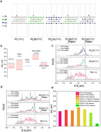 | Fig. 3. DFT calculations. (a) Theoretical structures of the Cl−-adsorbed nanocrystal surface. (b) The range of Cl− adsorption energies on different nanocrystal surfaces. PDOS analysis for nanocrystals (c) without and (d) with a Pt-skin on the surface. (e) Vacancy formation energies (Pt, Ni and Co) for Pt NCs, Pt3Ni NCs, and Pt3Co NCs. | |