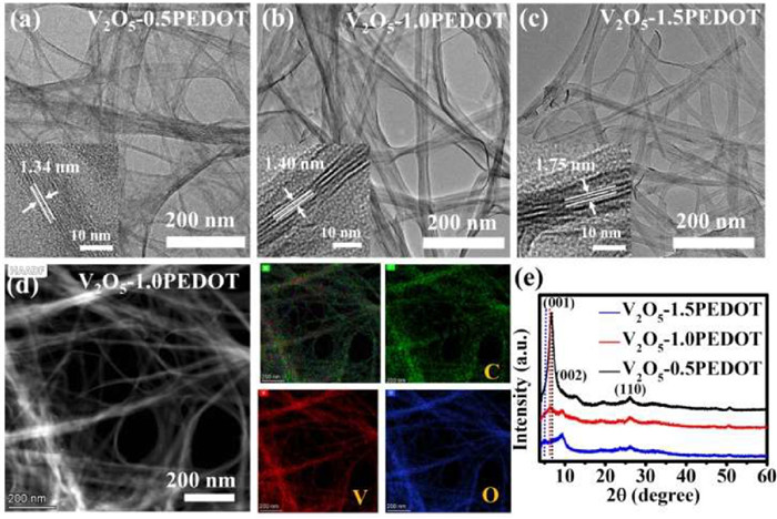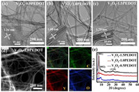 | Fig. 1. TEM images and HRTEM images of (a) V2O5–0.5PEDOT, (b) V2O5–1.0PEDOT and (c) V2O5–1.5PEDOT. (d) EDS elemental maps of V2O5–1.0PEDOT. (e) XRD patterns. | |