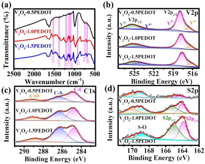 | Fig. 2. (a) FTIR spectra. XPS spectra of (b) V 2p, (c) C 1s, (d) S 2p obtain from V2O5–0.5PEDOT, V2O5–1.0PEDOT and V2O5–1.5PEDOT. | |