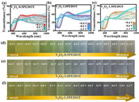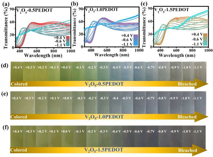 | Fig. 3. Spectroelectrochemistry and photographs under different voltages of (a, d) V2O5–0.5PEDOT (b, e) V2O5–1.0PEDOT (c, f) V2O5–1.5PEDOT. | |