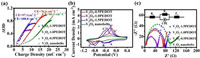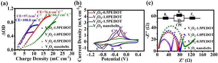 | Fig. 5. (a) Variation of the optical density induced per unit of inserted charge for V2O5–1.5PEDOT, V2O5–1.0PEDOT, V2O5–0.5PEDOT films and V2O5 nanobelts. (b) Cyclic voltammetry curve. (c) Nyquist plots. | |