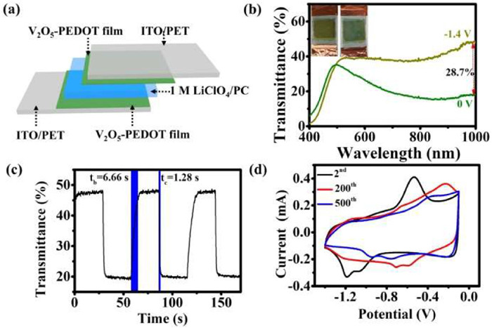 | Fig. 6. (a) Schematic of the electrochromic device based on V2O5-PEDOT film as the electrochromic layer and ion storage layer. (b) Transmittance spectra and digital photo of ECD. (c) Electrochromic response of ECD at 1000 nm by continuously stepping voltage between +0 V and −1.4 V. (d) CV curves of ECD in 2nd, 200th, 500th cycles. | |