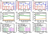 | Fig. 4. Response time curves and the stability test of (a, d) V2O5–0.5PEDOT (b, e) V2O5–1.0PEDOT (c, f) V2O5–1.5PEDOT by a voltage between +0.4 V and −0.6 V. Optical contrast curves of (g) V2O5–0.5PEDOT (h) V2O5–1.0PEDOT (i) V2O5–1.5PEDOT films. | |