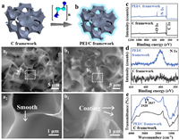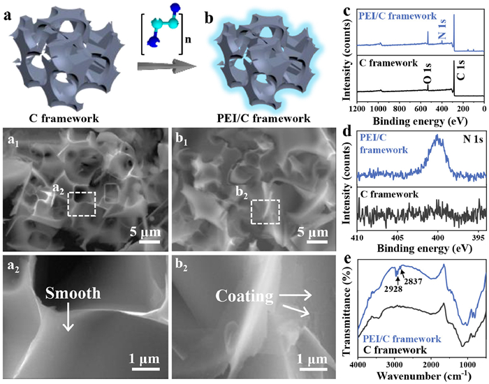 | Fig. 1. (a, b) The schematic diagram on the synthesis of PEI/C framework. The SEM images of (a1, a2) C framework and (b1, b2) PEI/C framework by a closed magnification. (c) The XPS survey spectra, (d) high-resolution N 1s spectra and (e) FT-IR spectra of C framework and PEI/C framework. | |