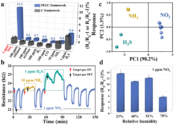 | Fig. 3. (a) The comparison on selectivity between C framework and PEI/C framework. (b) The real-time resistance curve and (c) PCA analysis of PEI/C framework to target NO2, interfering NH3 and H2S. (d) The comparison on sensing response to 1 ppm NO2 at various relative humidity. | |