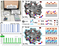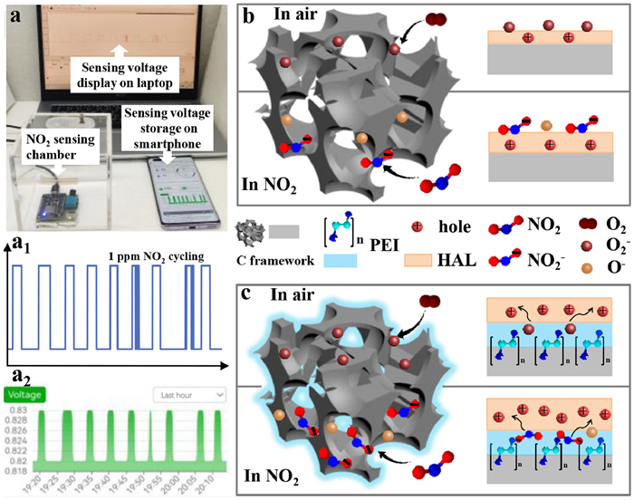 | Fig. 4. (a) The photograph of sensing-response curve simultaneously displayed on the laptop and smartphone. The records of sensing voltage to cycling 1 ppm NO2 on (a1) laptop and (a2) smartphone, respectively. The sensing mechanism schematic of (b) C framework and (c) PEI/C framework. | |