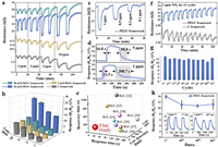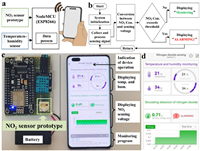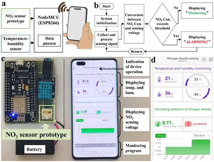 The NO2 sensing was simulated by building the sensing device integrated PEI/C framework, communicating with a smartphone. Specifically, the PEI/C framework sensor prototype and temperature-humidity (temp.-hum.) sensor are connected to the microcontroller NodeMCU (ESP8266), which conducts Wireless Fidelity (Wi-Fi) communication between the sensors and smartphone, and the corresponding block diagram is schematized in Fig. 5a. Meanwhile, the NodeMCU performs the program to process the sensing data from PEI/C framework sensor prototype and temp.-hum. sensor, and to control the NO2 alarming, the flow chart of the main program is shown in Fig. 5b. Notably, the NO2 sensor prototype on the sensor module and the displayed information on the smartphone are marked in Fig. 5c. Experimentally, the alarming was simulated in the supplementary video, when 3 ppm NO2 was injected and the sensing voltage reach alarm threshold, the smartphone shows red "AlARMING!" word (Fig. 5d). When the sensor module is placed in the air, the green "Monitoring" display on smartphone (Fig. 5c). Remarkably, as above presented sensor module powered by battery, the environmental temp.-hum. and NO2 sensing data can be remotely monitored and updated in real-time by the smartphone.
