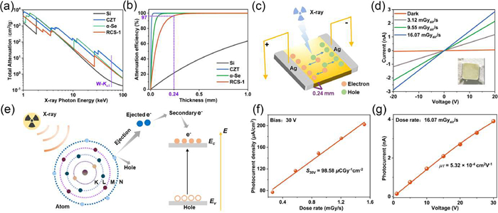 | Fig. 3. X-ray detection performance of RCS-1: (a) Calculated mass attenuation coefficients and (b) thickness dependent attenuation efficiency. Commercial X-ray detection materials Cd(Zn)Te, a-Se and Si are included for comparison. (c) Schematic illustration of the pellet X-ray detector. (d) I−V curves under the X-ray off and on with different exposed dose rates and actual electrode diagram (inset). (e) Mechanism for X-ray photon to current conversion. (f) Photocurrent density versus dose rate measured at a bias voltage of 30 V. (g) Voltage-dependent photocurrent curves fitted by the Hecht equation. | |