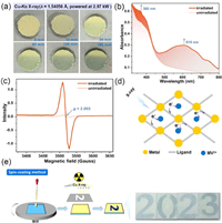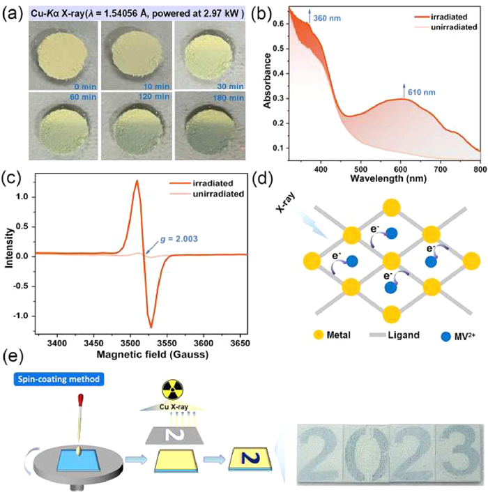 | Fig. 4. Radiochromic behavior for RCS-1: (a) Time-dependent color change when exposing to Cu-Kα X-ray. (b) Electronic absorption spectra before and after irradiation by the Cu-Kα X-ray. (c) EPR spectra before and after irradiation by the Cu-Kα X-ray. (d) Schematic diagram of electron transfer mechanism. (e) Radiochromism imaging. | |