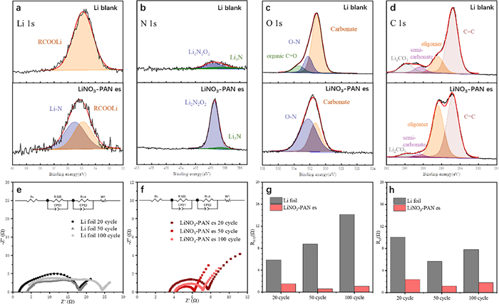 | Fig. 4. XPS spectra of (a) Li 1s, (b) N 1s, (c) O 1s, (d) C 1s of Li metal anode with LiNO3-PAN es covered after 50 cycles at a current density of 1 mA/cm2 and a fixed capacity of 1 mAh/cm2 in carbonate electrolyte. EIS Nyquist diagram of Li symmetric cells of (e) bare Li metal anode and (f) LiNO3-PAN es covered Li metal anode in different cycles. The plots and the curves are the experimental and the corresponding fitting results, respectively. (g, h) The RSEI and Rct fitting result of Li symmetric cell of bare Li metal anode and LiNO3-PAN es covered Li metal anode. | |