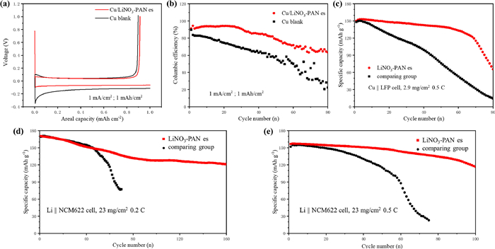| Fig. 5. (a) The Li+ electrodepositing/stripping curve of Li||Cu cell and Li||LiNO3-PAN es|Cu cell, and (b) their corresponding coulombic efficiency. (c) The Cu||LPF full cell that used Cu foil covered with LiNO3-PAN es interlayer as current collector for Li deposition. (d, e) The cycle performance of NCM622||Li full cell with LiNO3-PAN es interlayer added. | |