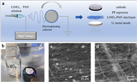 | Fig. 2. (a) Schematic configurations of the synthesis process of the LiNO3-PAN es. (b) The synthesized LiNO3-PAN es interlayer was 16 mm in diameter. (c, d) The SEM image of LiNO3-PAN es interlayer cloth. | |