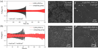 | Fig. 3. The electrochemical performance of Li||Li symmetrical cell cycle test at (a) current density of 1 mA/cm2 with Li capacity of 1 mAh/cm2 and (b) current density of 4 mA/cm2 with Li capacity of 1 mAh/cm2. SEM image of pristine Li foil after 50 cycles and Li foil covered with LiNO3-PAN es interlayer after 50 cycles at a current density of (c, d) 1 mA/cm2 and (e, f) 4 mA/cm2. | |