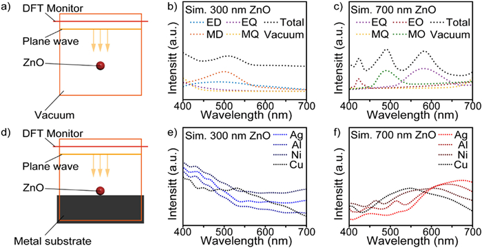 | Fig. 1. (a) Schematic diagram of FDTD-simulation of a single ZnO sphere in a vacuum environment. (b) FDTD-simulated reflection spectra of a single ZnO sphere with 300 nm diameters in a vacuum environment. (c) FDTD-simulated reflection spectra of a single 700 ZnO sphere in a vacuum environment. (d) Schematic diagram of FDTD-Simulation of a single ZnO sphere on different metal substrates. (e) FDTD-simulated reflection spectra of a single 300 nm ZnO sphere on different metal substrates. (f) FDTD-simulated reflection spectra of a single 700 nm ZnO sphere on different metal substrates. | |