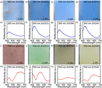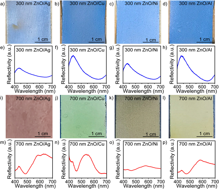 | Fig. 2. (a–h) Digital photos and experimental reflection spectra of structural color films of ZnO spheres with 300 nm diameters on different metal substrates. (i–p) Digital photos and experimental reflection spectra of structural color films of ZnO spheres with 700 nm diameters on different metal substrates (Scale bar = 1 cm). | |