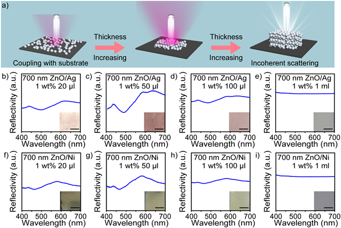 | Fig. 3. (a) Schematic diagram of the scattering effect with the increase of the spheres. (b–e) Experimental reflection spectra and digital photos of structural color films of ZnO spheres with 700 nm diameters on Ag substrates. (f–i) Experimental reflection spectra and digital photos of structural color films of ZnO spheres with 700 nm diameters on Ni substrates (Scale bar = 1 cm). | |