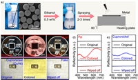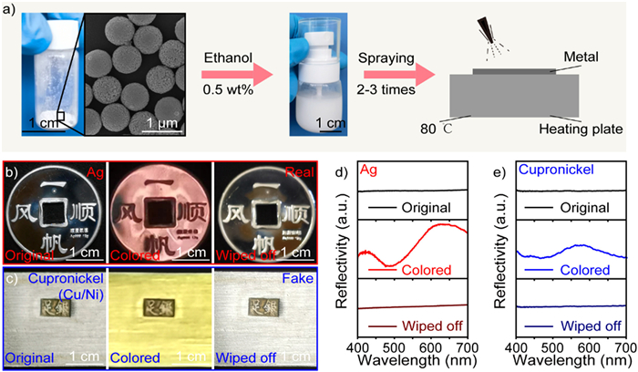 | Fig. 4. (a) Scheme for visual identification by spray method using atomizer. (b) Digital photographs of Mie colored real Ag coin fabricated by spray method using atomizer. (c) Digital photographs of Mie colored fake Cupronickel paperweight fabricated by spray method using atomizer. (d) Corresponding reflection spectrum of Mie colored real Ag coin. (e) Corresponding reflection spectrum of fake Cupronickel paperweight. | |